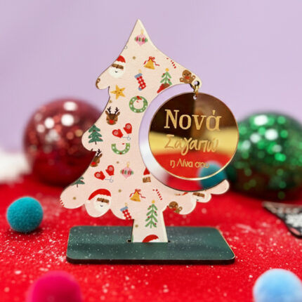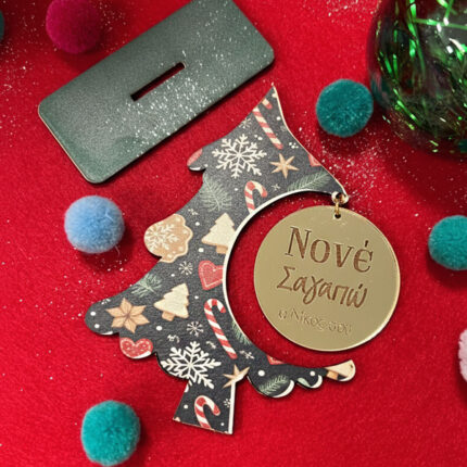 Χριστουγεννιάτικο Γούρι για Νονά – “Κρεμαστό Χρυσό Plexi Σε Ξύλινο Δεντράκι”