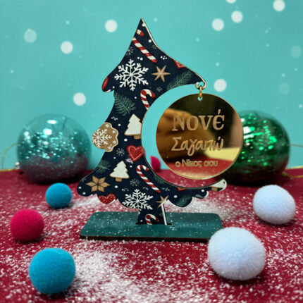 Χριστουγεννιάτικο Γούρι για Νονό – “Κρεμαστό Χρυσό Plexi Σε Ξύλινο Δεντράκι”