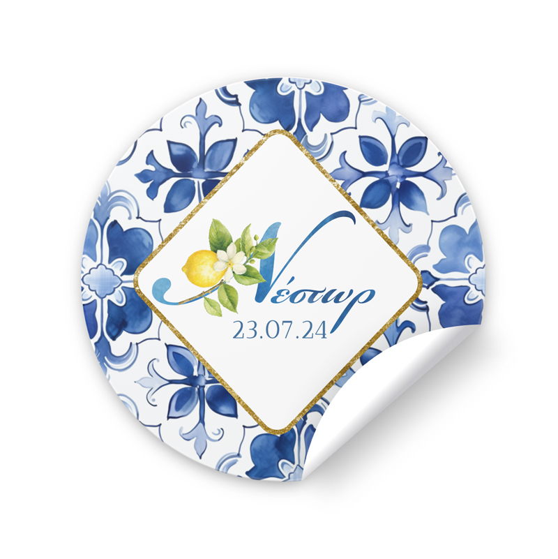 Στρογγυλά αυτοκόλλητα με σχέδιο Mediterranean Λεμόνι για να διακοσμήσεις τα αντικείμενα της Βάπτισης ή να τα δώσεις ως ενθύμιο δώρο στους μικρούς καλεσμένους!