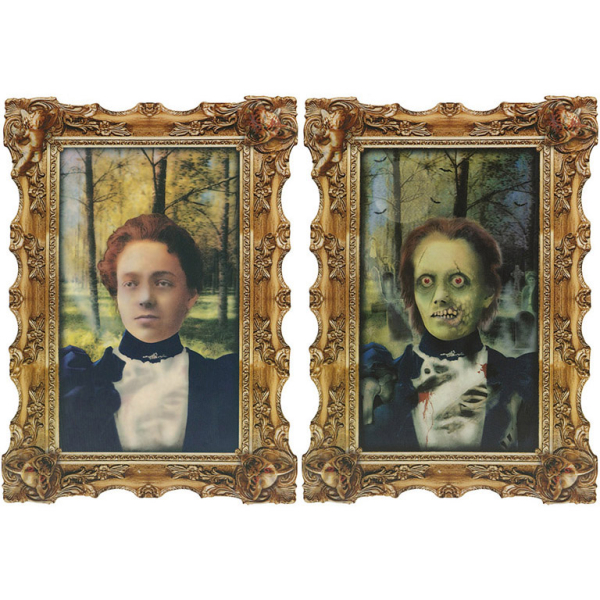 Αυτό το πορτρέτο είναι ζωντανό! Μετέτρεψε το σπίτι σου σε στοιχειωμένο με το πορτρέτο Scary Ghoul και τρόμαξέ τους όλους στο φετινό Halloween! Εξαιτίας της φακοειδούς εκτύπωσης (Lenticular printing), το πορτρέτο αλλάζει μορφή ανάλογα με την οπτική γωνία δίνοντας την ψευδαίσθηση ότι είναι ζωντανό! Από την μία γωνία θα δείτε ένα κανονικό ιστορικό πορτρέτο ενός κοριτσιού και από την άλλη οπτική γωνία, ένα πορτρέτο εμπνευσμένο από το Halloween ενός πράσινου ζόμπι με τρομακτικό φόντο!