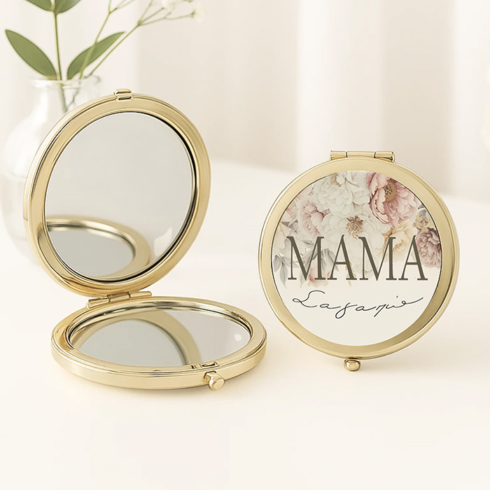 Μεταλλικό καθρεφτάκι στρογγυλό που ανοίγει, σε χρυσό χρώμα και το όνομα της επιλογής σου για να το χαρίσεις ως δώρο στην αγαπημένη σου μαμά!