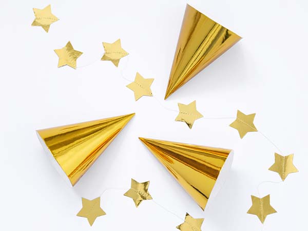 Καπελάκια πάρτυ κατασκευασμένα από χαρτί σε χρυσό μεταλλικό χρώμα.