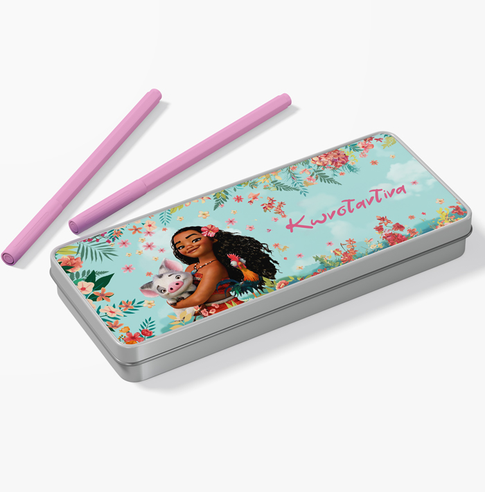 Μεταλλική κασετίνα με σχέδιο Μοάνα και τυπωμένο το όνομα! Βάλε σ’αυτή τα αγαπημένα σου σχολικά αντικείμενα ή δώρισέ την σε μια φίλη σου και ξεχωρίστε στην τάξη!