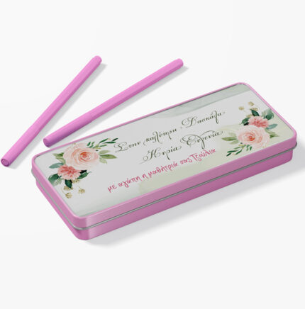 Μεταλλική κασετίνα με σχέδιο ροζ-χρυσό γκλίτερ και τυπωμένο το όνομα! Βάλε σ’αυτή τα αγαπημένα σου σχολικά αντικείμενα ή δώρισέ την σε μια φίλη σου και ξεχωρίστε στην τάξη!