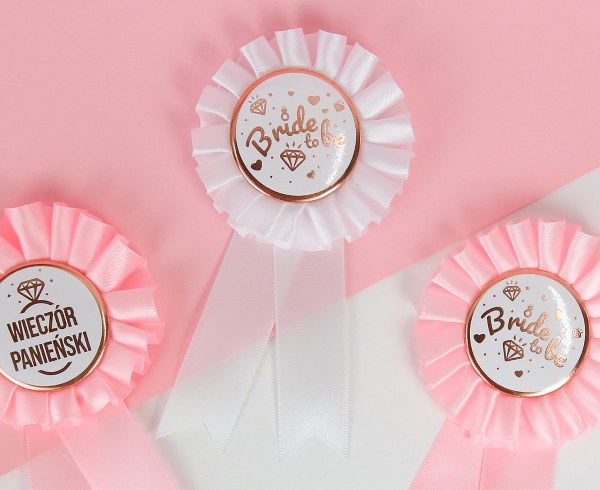 Κονκάρδα παράσημο “”Bride to be”” σε λευκό χρώμα με ροζ-χρυσά γράμματα, για να φορέσει η μέλουσα νύφη και να ξεχωρίζει στο Bachelor πάρτυ!
