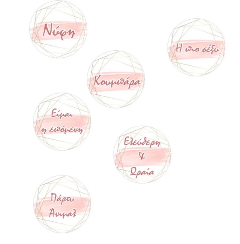 Κονκάρδες με γεωμετρικό σχέδιο για Bachelor Party. Για να γνωρίζουν όλοι στο χώρο την ιδιότητα της κάθε φίλης!