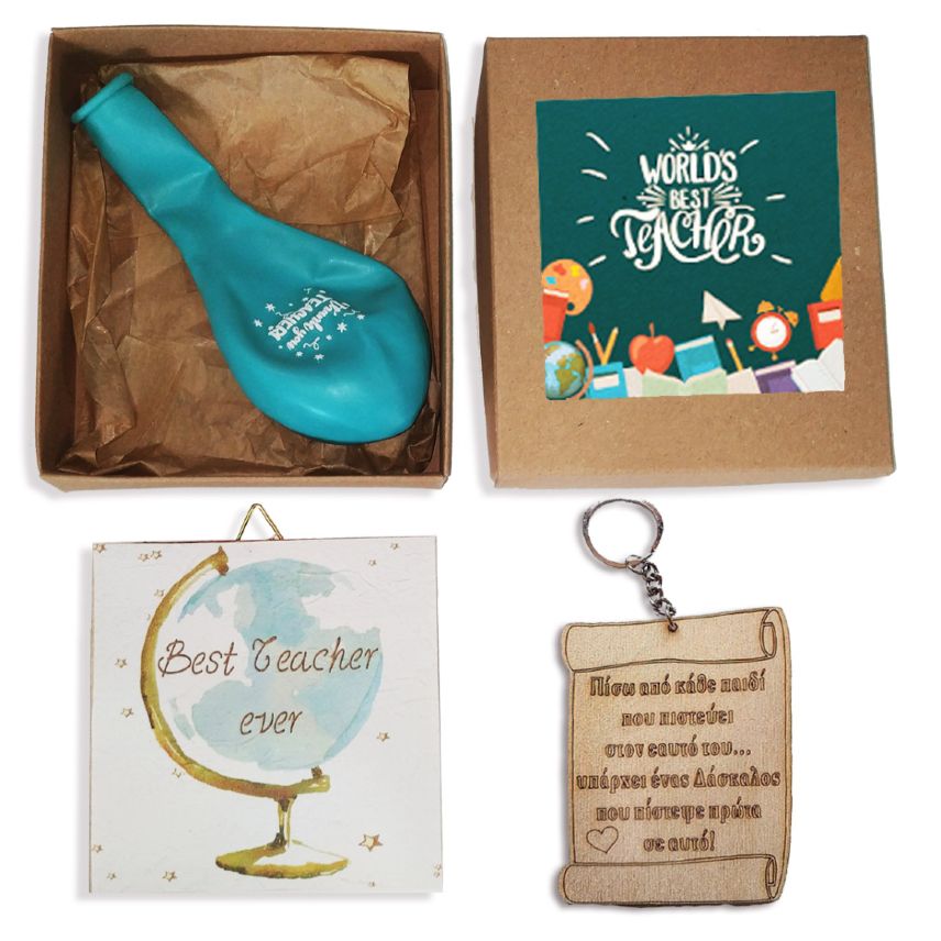 - Περιλαμβάνει: 1 ξύλινο καδράκι “Best Teacher Ever”, 1 ξύλινο μπρελόκ, 1 μπαλόνι “Thank You Teacher”