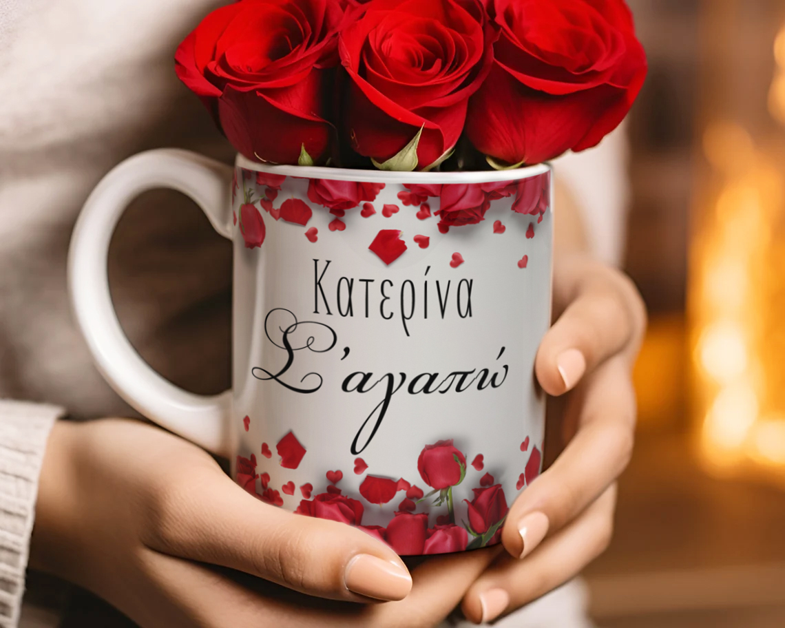 Κούπα με κόκκινα τριαντάφυλλα, το όνομα της επιλογής σου και μήνυμα: “Σ’ αγαπώ” για να χαρίσεις στο άλλο σου μισό ως δώρο και να το κάνεις να νιώσει ξεχωριστό την ημέρα του Αγίου Βαλεντίνου ή και της επετείου σας!