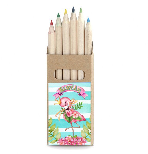 Προσωποποιημένες ξυλομπογιές με θέμα Φλαμίνγκο, σε κραφτ κουτάκι, για να χαρίσετε στους μικρούς καλεσμένους.