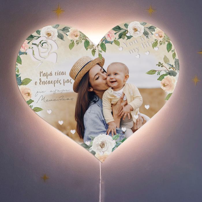 Εντυπωσιακό προσωποποιημένο ξύλινο φωτιστικό σε σχήμα καρδιάς! Ένα μοναδικό δώρο, με την φωτογραφία σας τυπωμένη επάνω, για να χαρίσεις στην αγαπημένη σου μαμά. Θα διακοσμεί το δωμάτιο και θα της θυμίζει πόσο την αγαπάς!