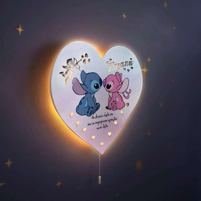 Εντυπωσιακό ξύλινο φωτιστικό αγάπης σε σχήμα καρδιάς και σχέδια τα τερατάκια Λίλο & Στιτς! Ένα μοναδικό δώρο για να χαρίσεις στο αγαπημένο σου πρόσωπο, που θα διακοσμεί το δωμάτιο και θα σε θυμίζει!
