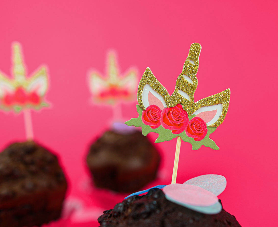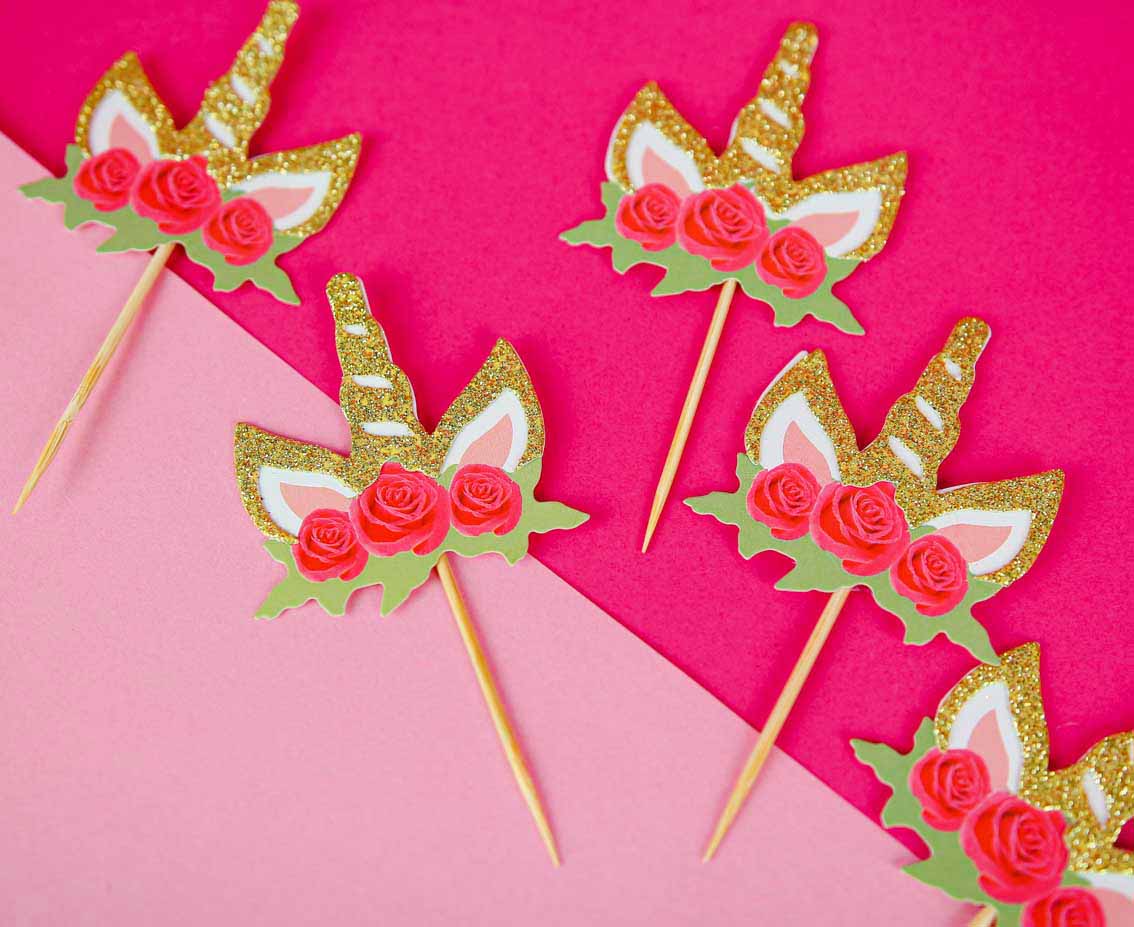 Διακοσμήστε εντυπωσιακά την τούρτα και τα φαγητά του πάρτυ ή της βάπτισης με topper στο θέμα Μονόκερο με σχέδιο χρυσό γκλίτερ και όμορφα λουλούδια!