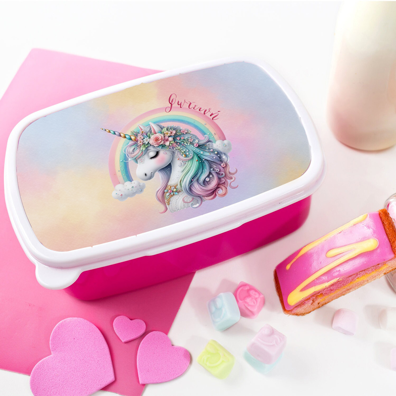 - Ροζ πλαστικό τάπερ με λευκό εκτυπωμένο καπάκι