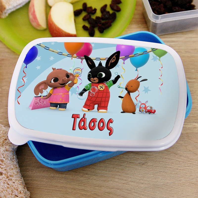 - Γαλάζιο πλαστικό τάπερ με λευκό εκτυπωμένο καπάκι