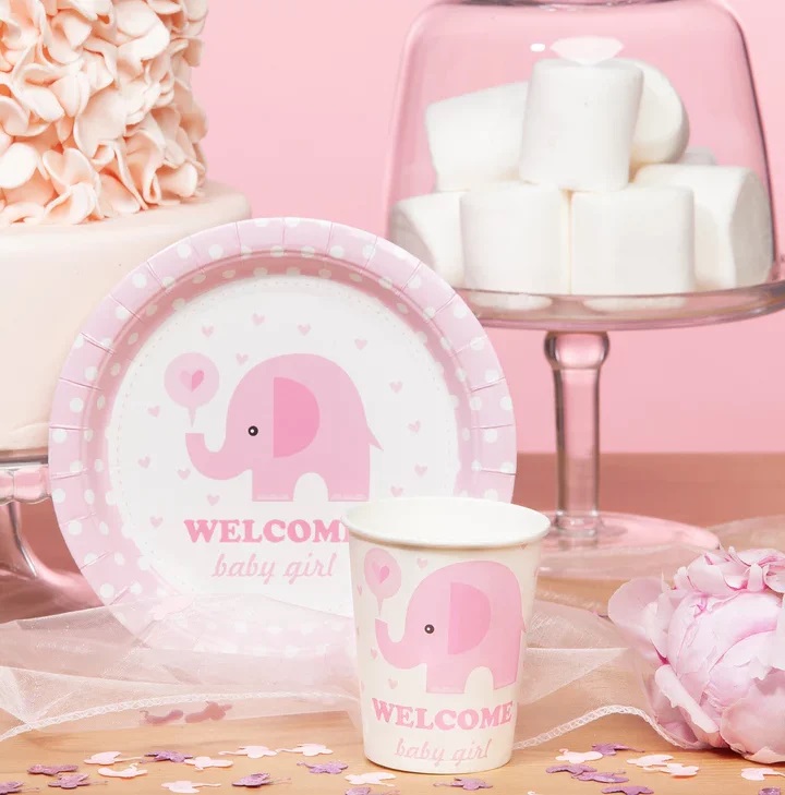 Πιάτα με ροζ Ελεφαντάκι και μήνυμα Welcome Baby Girl, για το μπουφέ του Baby Shower ή της βάπτισης.