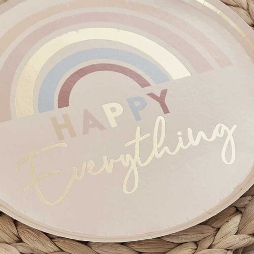 Πιάτα χάρτινα με σχέδιο Ουράνιο Τόξο και μήνυμα “”Happy Everything””, για να σερβιριστούν οι καλεσμένοι σας στην εκδήλωση!
