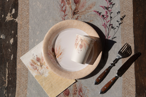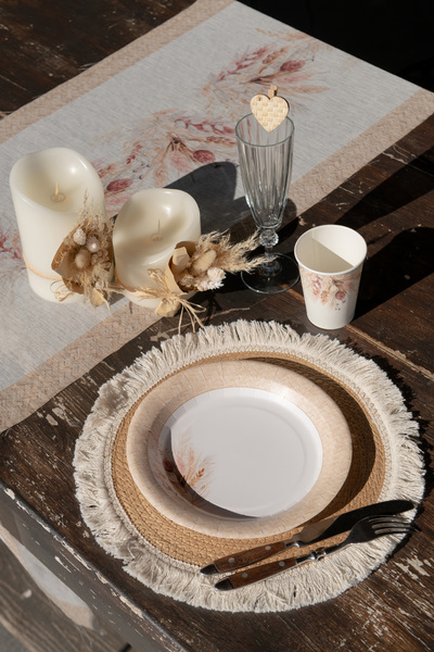 Πιάτα φαγητού Romance με σχέδιο μπεζ ψάθινο περίγραμμα και αποξηραμένα λουλούδια, για να σερβιριστούν οι καλεσμένοι σας στο γάμο, τη βάπτιση ή την εκδήλωση!