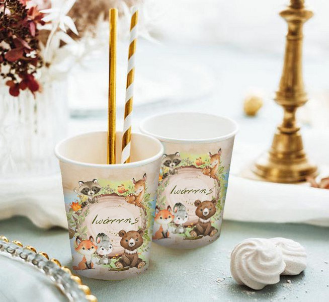 Ποτηράκια με το όνομα του παιδιού και θέμα χαριτωμένα ζώα του δάσους, για να κεράσετε τους καλεσμένους σας!