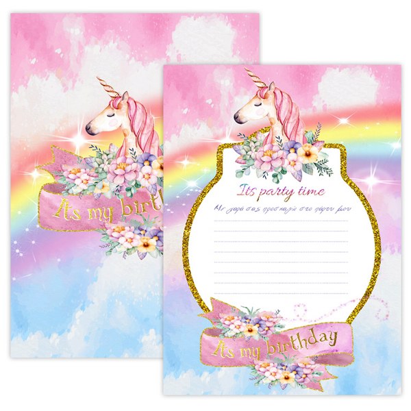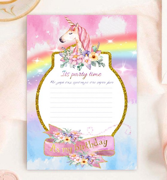 ΣυσκευασίαΠροσκαλέστε τους αγαπημένους σας φίλους σε ένα μαγικό πάρτυ, με ένα εντυπωσιακό προσκλητήριο με φλοράλ Μονόκερο!