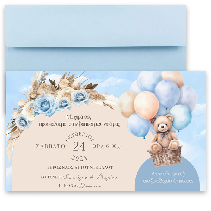 Προσκλητήριο Βάπτισης με θέμα Αρκουδάκι, για να μοιράσετε στους αγαπημένους σας για τη βάπτιση του μικρού σας και να κλέψετε τις εντυπώσεις.