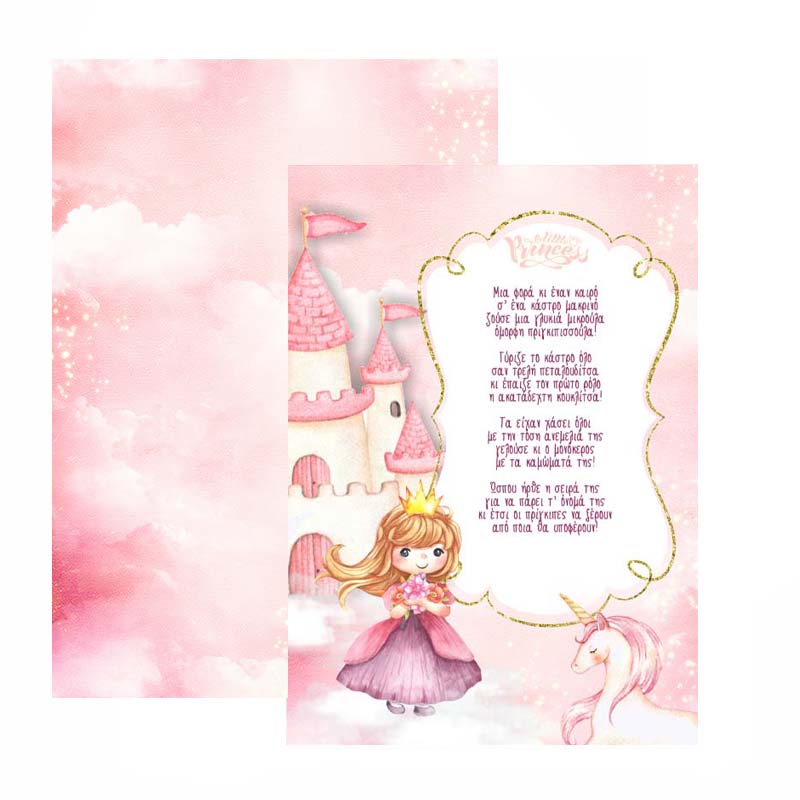 Μονόκαρτο προσκλητήριο με θέμα Πριγκίπισσα & Μονόκερος, για να καλέσετε τα αγαπημένα σας άτομα στη βάπτιση του μωρού σας!