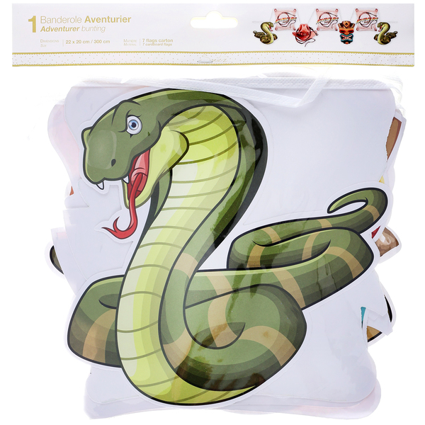 - Η συσκευασία περιέχει: 7 σημαιάκια 300 εκ.(2 σημαιάκια φίδι,1 σημαιάκι καπέλο εξερευνητή,1 σημαιάκι τροπική μάσκα και 3 σημαιάκια-πάπυρους με εκτύπωση ADVENTURE PARTY)