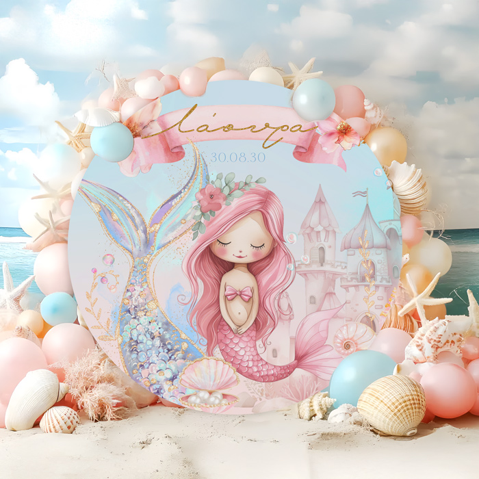 Στρογγυλή αφίσα από μουσαμά με θέμα Ροζ Γοργόνα, για να διακοσμήσετε το χώρο της βάπτισης του μωρού σας!