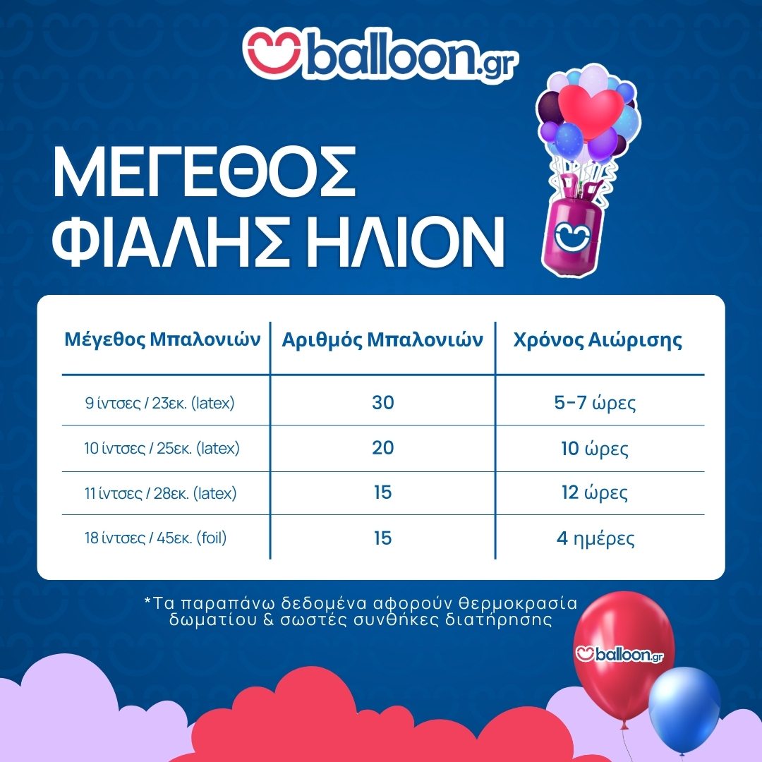 - Για καλύτερο αποτέλεσμα, θα πρέπει τα μπαλόνια να φουσκωθούν 1-2 ώρες πριν την εκδήλωση και όχι πολλές ώρες πριν