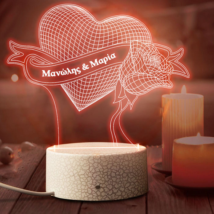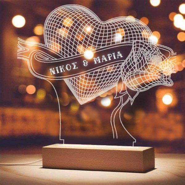 Εντυπωσιακό προσωποποιημένο φωτιστικό led Καρδιά & Τριαντάφυλλο με ονόματα, για να χαρίσετε στο άλλο σας μισό και να δείξετε την αγάπη σας!