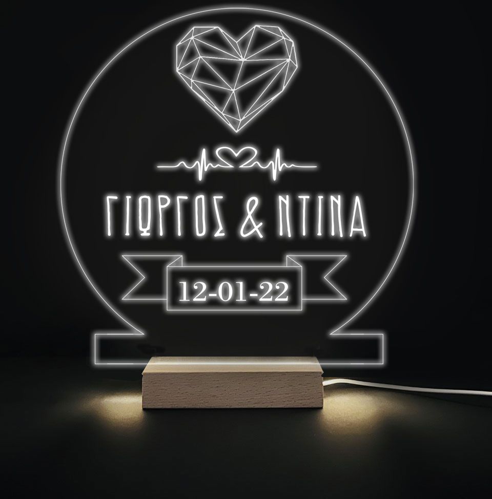 Εντυπωσιακό φωτιστικό led “Diamond Heart” με τα ονόματά και την ημερομηνία σας από plexiglass. Ένα μοναδικό δώρο για να χαρίσεις στο αγαπημένο σου πρόσωπο, που θα διακοσμεί το δωμάτιο και θα σε θυμίζει!