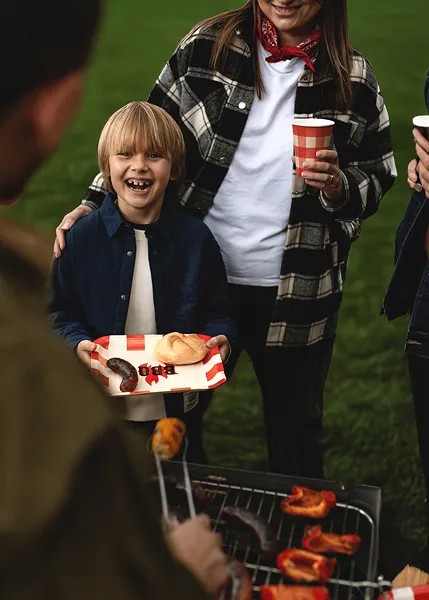 Τετράγωνα χάρτινα πιάτα με εντυπωσιακό σχέδιο BBQ σε κόκκινο και κρεμ χρώμα, διακοσμημένα με μαύρη επιγραφή και φλόγα στο κέντρο.