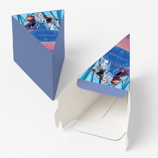 Χάρτινη τούρτα με θέμα Frozen, με το όνομα του παιδιού & εντυπωσιακό design. Η χάρτινη τούρτα αποτελείται από 12 ξεχωριστά κομμάτια, τα οποία όταν συναρμολογηθούν σχηματίζουν έναν ολοκληρωμένο κύκλο – μια εντυπωσιακή παρουσίαση για κάθε είδους εκδήλωση. Κάθε κομμάτι είναι σχεδιασμένο σαν φέτα τούρτας και λειτουργεί ταυτόχρονα ως κουτάκι, ιδανικό για γλυκά ή μικρά δωράκια.
