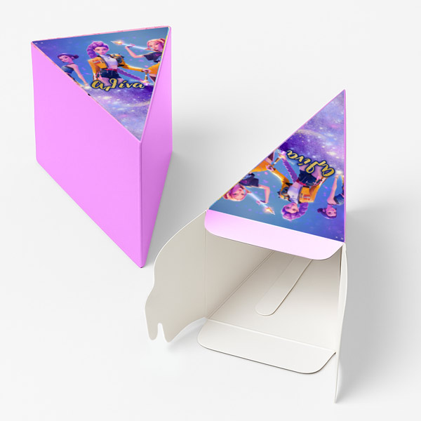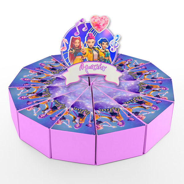 Χάρτινη τούρτα με θέμα K-Pop Demon Hunters, με το όνομα του παιδιού & εντυπωσιακό design. Η χάρτινη τούρτα αποτελείται από 12 ξεχωριστά κομμάτια, τα οποία όταν συναρμολογηθούν σχηματίζουν έναν ολοκληρωμένο κύκλο – μια εντυπωσιακή παρουσίαση για κάθε είδους εκδήλωση. Κάθε κομμάτι είναι σχεδιασμένο σαν φέτα τούρτας και λειτουργεί ταυτόχρονα ως κουτάκι, ιδανικό για γλυκά ή μικρά δωράκια.
