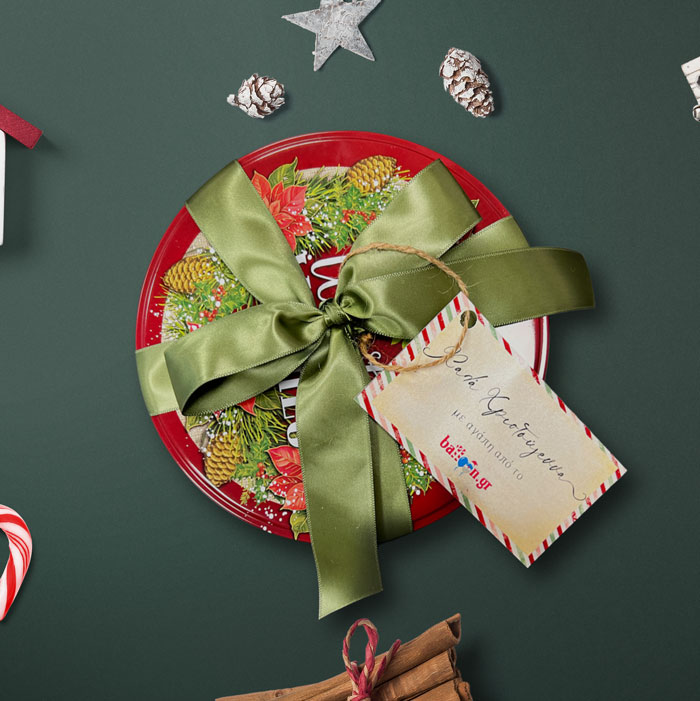 - Περιλαμβάνει: Χριστουγεννιάτικο τσίγκινο κουτί για μπισκότα (διάμετρος: 15 cm) και 4 στολίδια με ευχές