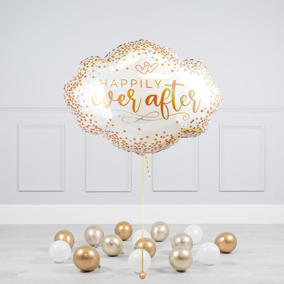 Μπαλόνι σε σχήμα σύννεφου με τη φράση “Happily Ever After”, ιδανικό για γάμους, αρραβώνες ή επετείους. Διακοσμημένο με χρυσά, ασημί και ροζ κομφετί και δύο μικρές καρδιές στο Εεπάνω μέρος.