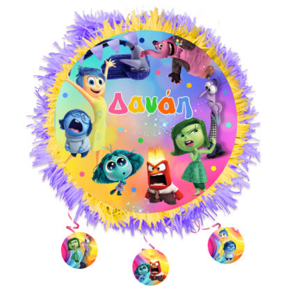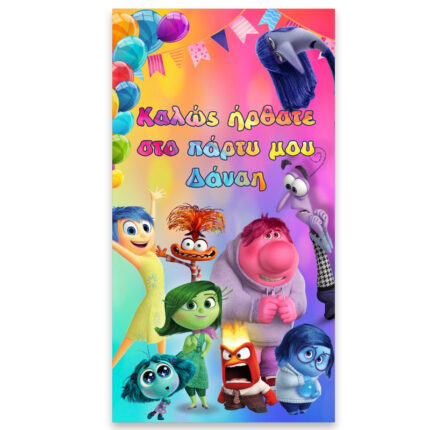 Banner πάρτυ Inside Out (Τα μυαλά που κουβαλάς) και τυπωμένο το όνομα της επιλογής σας! Μπορεί να χρησιμοποιηθεί ως runner για τη διακόσμηση του τραπεζιού ή ως banner στην πόρτα ή τον τοίχο.