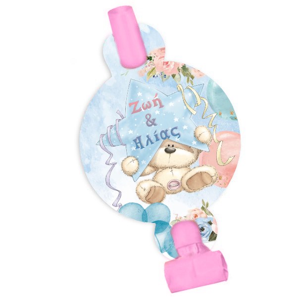 Προσωποποιημένα Blowouts με θέμα Αρκουδάκι και τυπωμένα τα ονόματα των διδύμων, για να μοιράσετε στους μικρούς καλεσμένους της βάπτισης ή του πάρτυ και να τους βάλετε σε γιορτινή διάθεση!